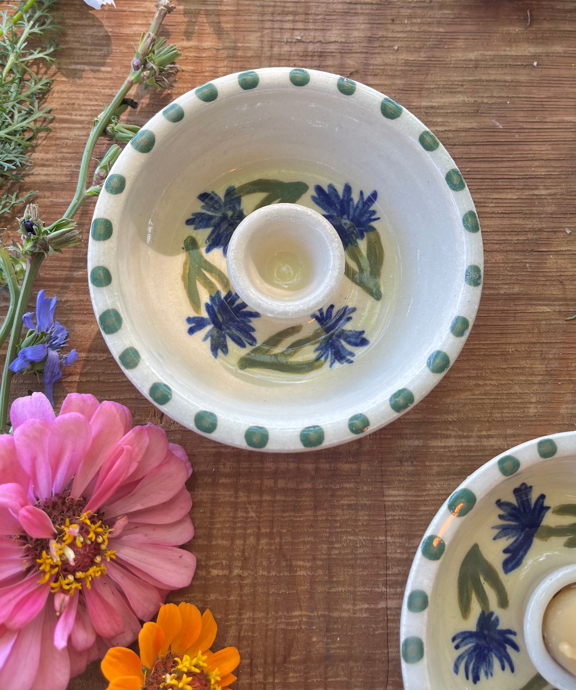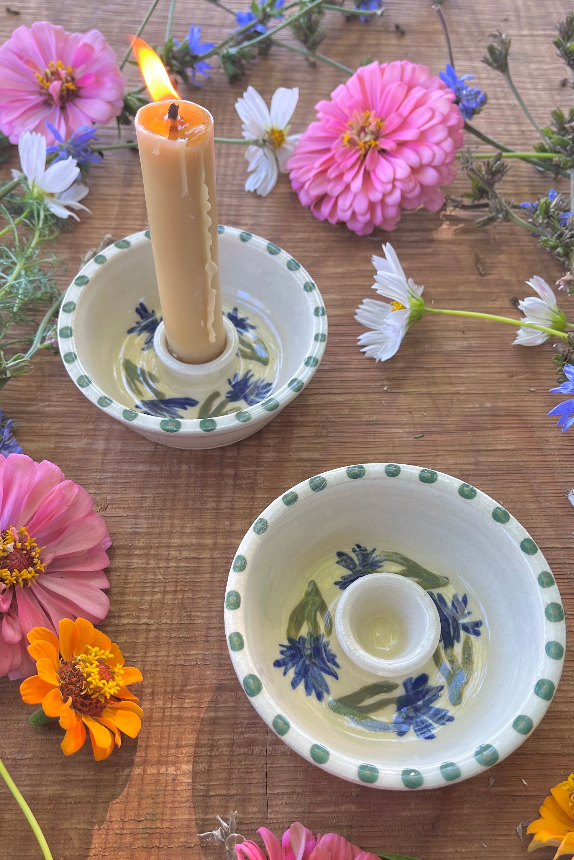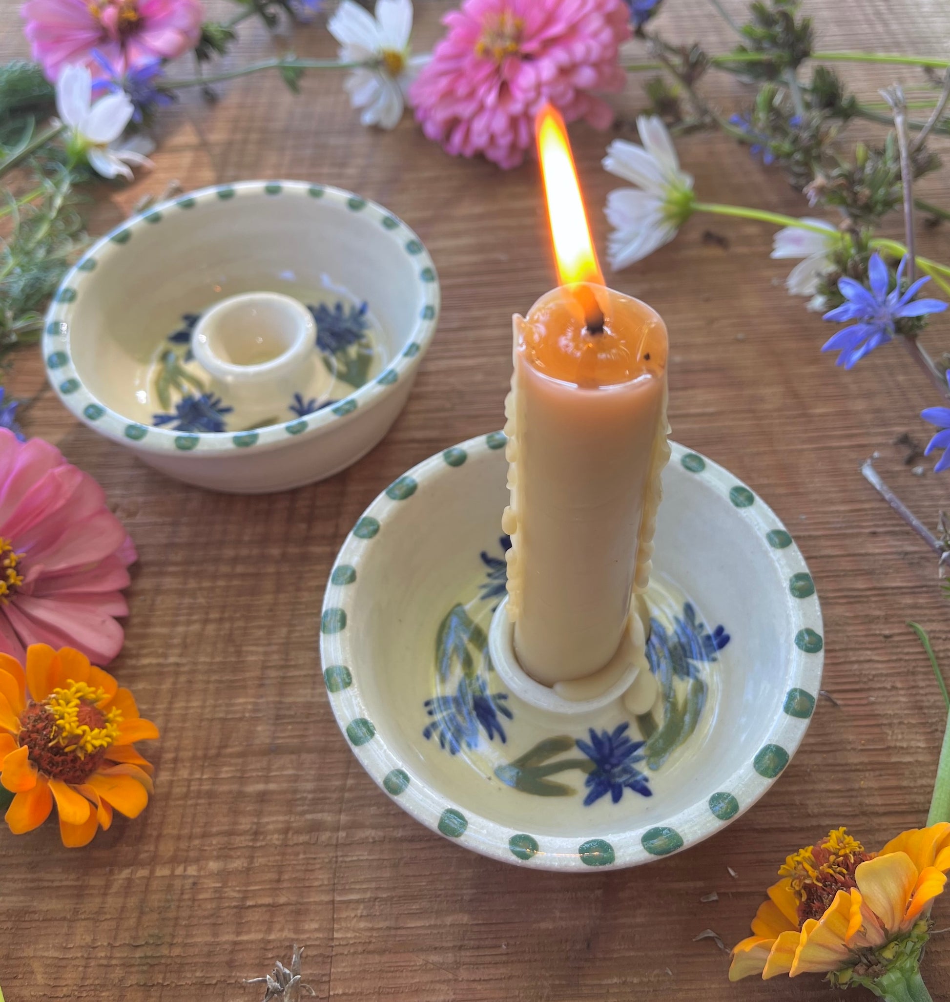 Enjoy the beauty of candlelight with these stoneware candle holders. Wheel-thrown design offers a secure fit for a standard 1" or smaller taper candle. Hand-painted interior with blue and green cornflowers (also know as bachelor buttons) creates a well for melted wax. Outside is white with a glossy glaze.