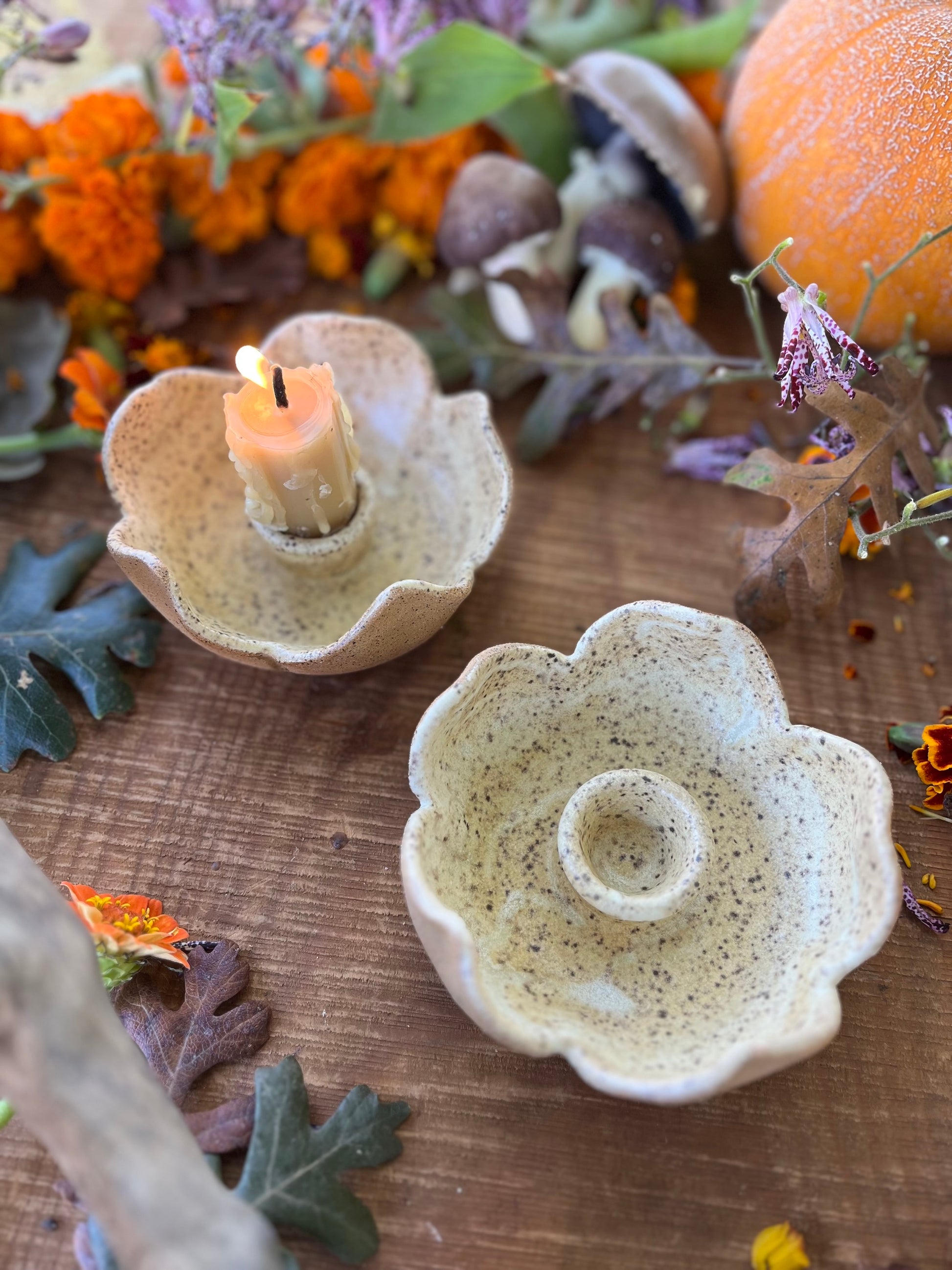 Enjoy the beauty of candlelight with these stoneware candle holders. Wheel-thrown design offers a secure fit for a 1" taper candles (or smaller). Flower petal design creates a well for melted wax, and allows you to carry your light from room to room. Satiny cream glaze on the interior highlights the naturally speckled brown clay body. Outside is unglazed.