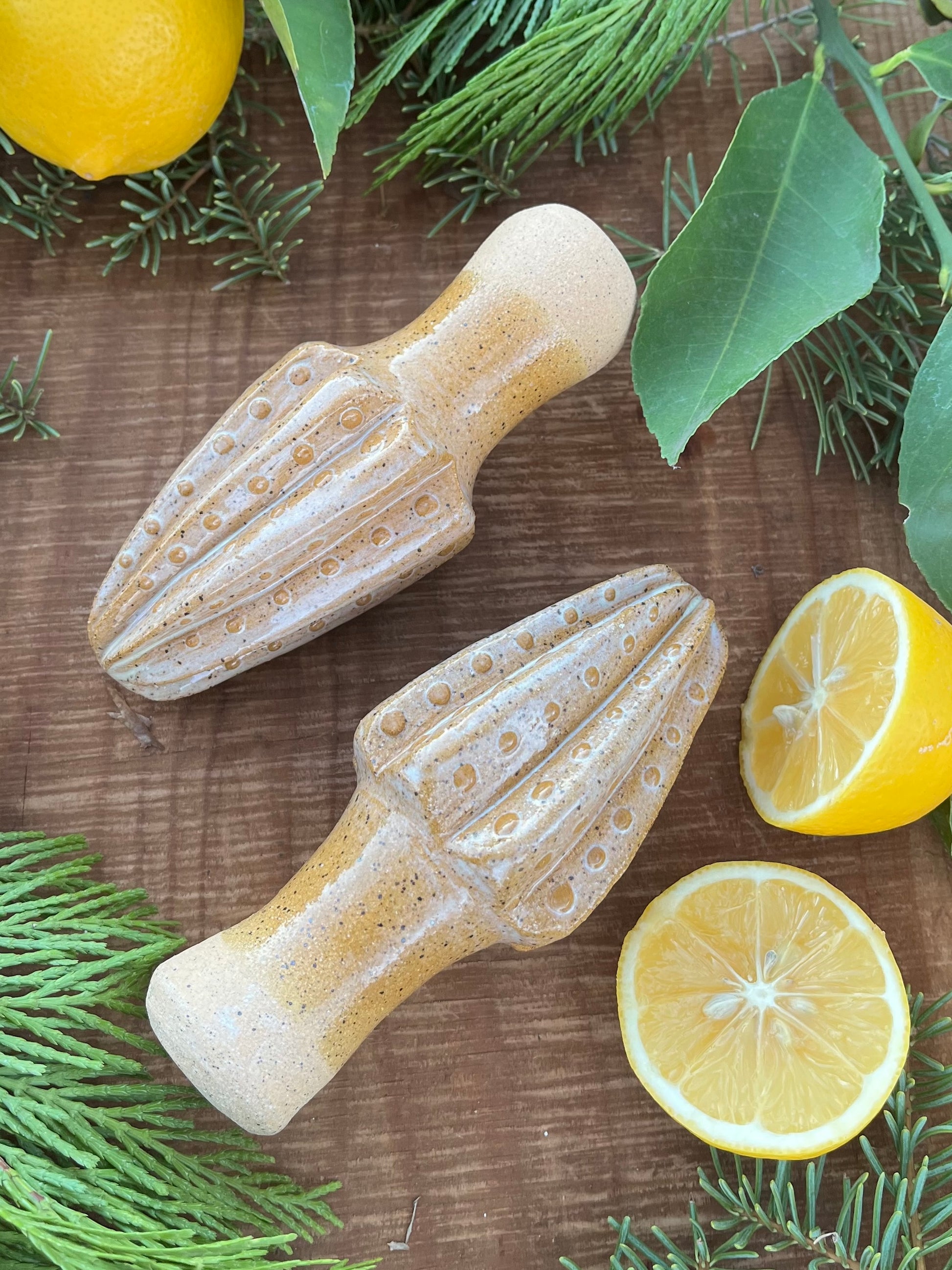 Whether you love to cook or mix cocktails, nothing brightens up your kitchen decor or barware than this handmade reamer! Wheel-thrown, carved, and slip-trailed details with glossy glaze over the top.