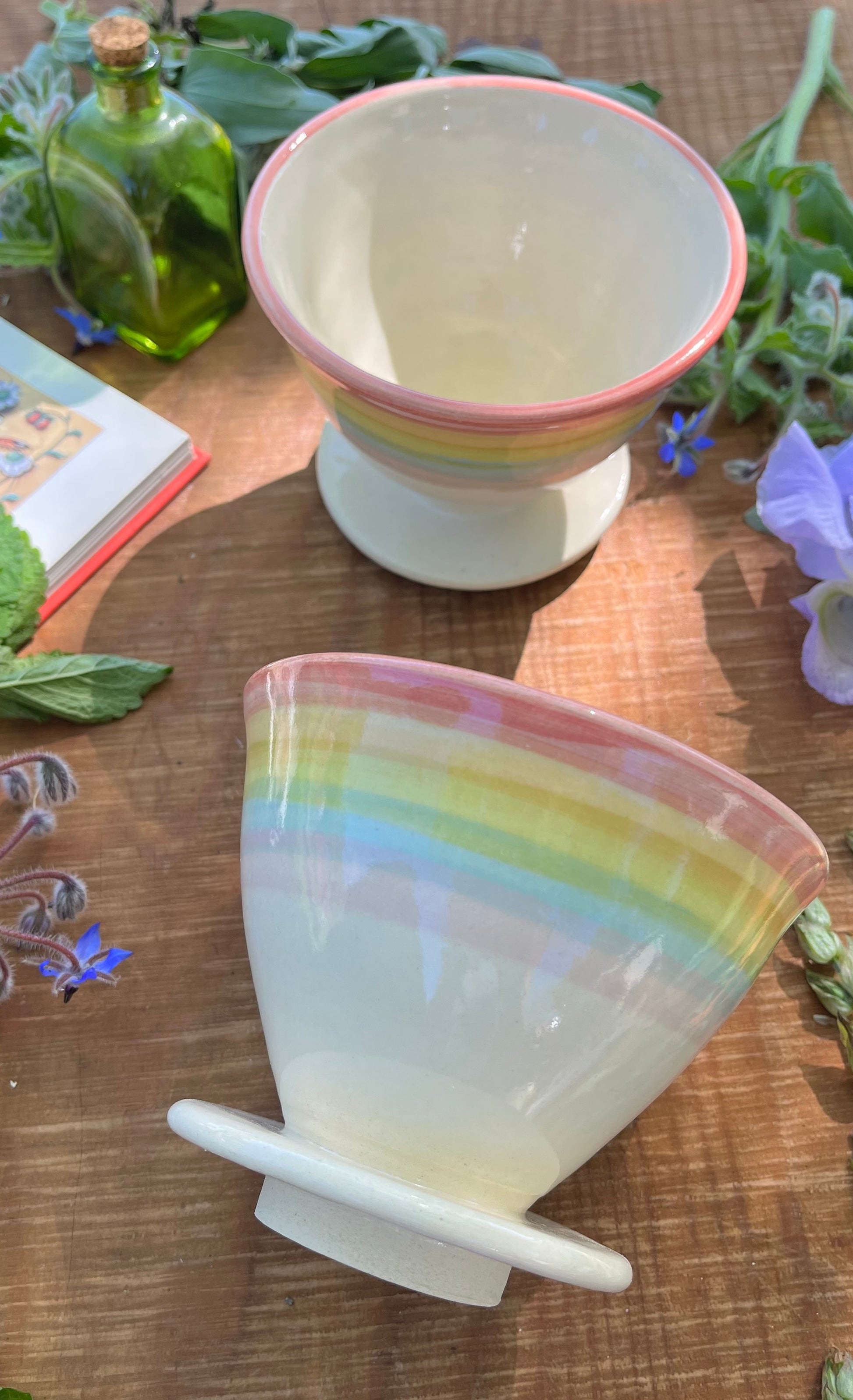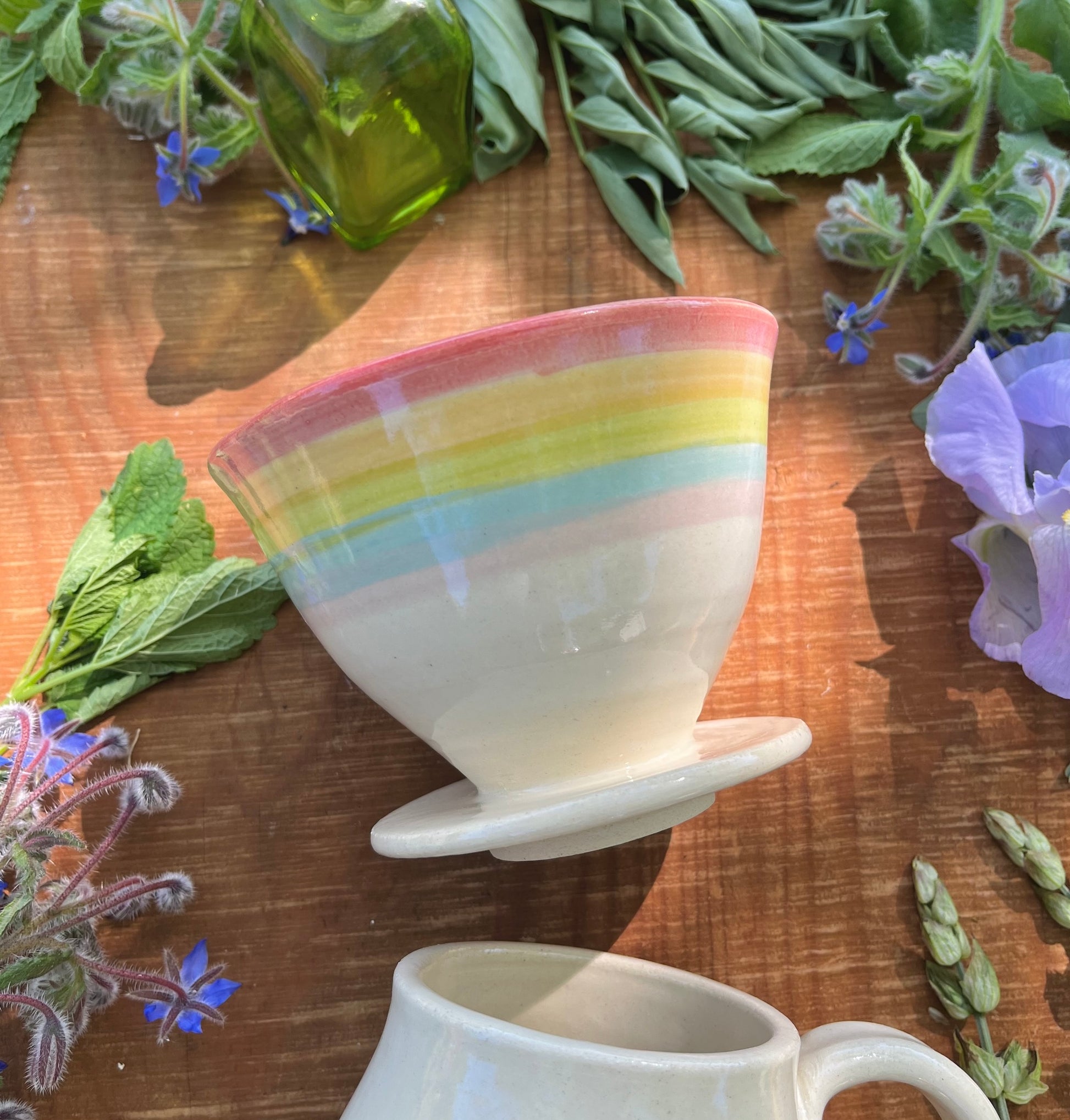 Wheel-thrown and hand-painted, this coffee cone is hand-painted with a lovely rainbow painted on the rim, covered in a glossy clear glaze. Bottom footing is unglazed.