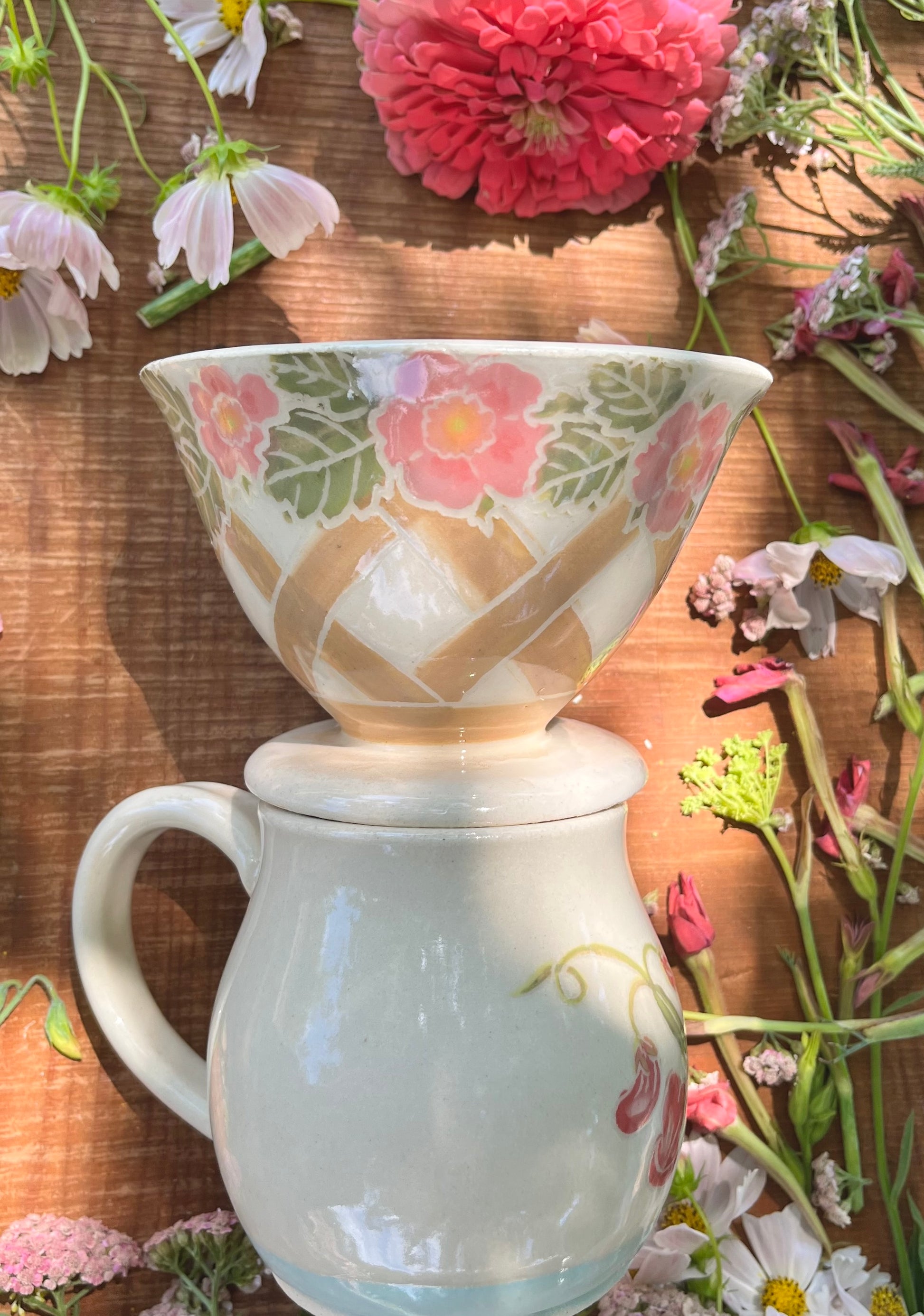 Wheel-thrown and hand-painted, this coffee cone is hand-painted with a lovely wild rose and trellis design, covered in a glossy clear glaze. Bottom footing is unglazed.
