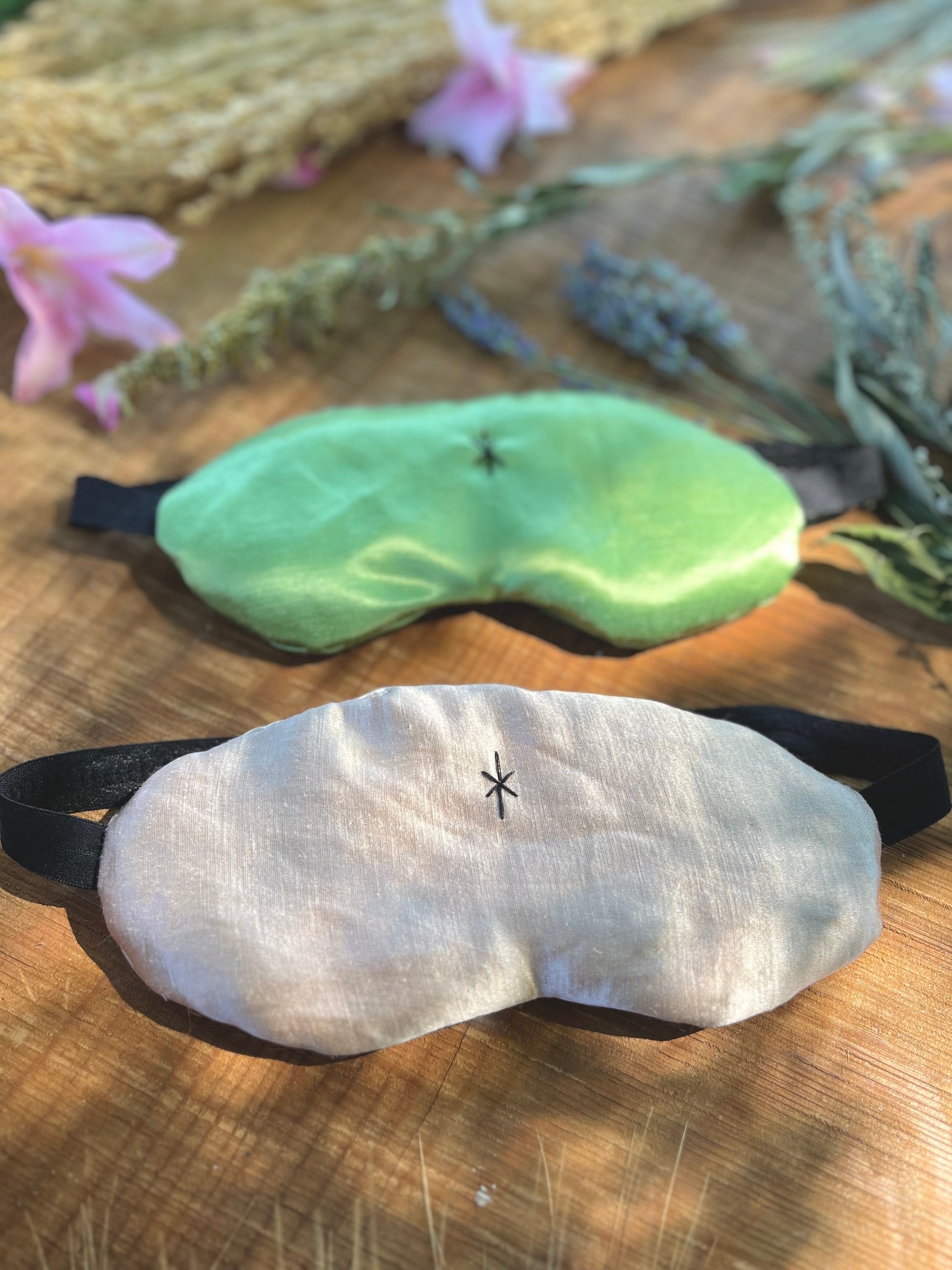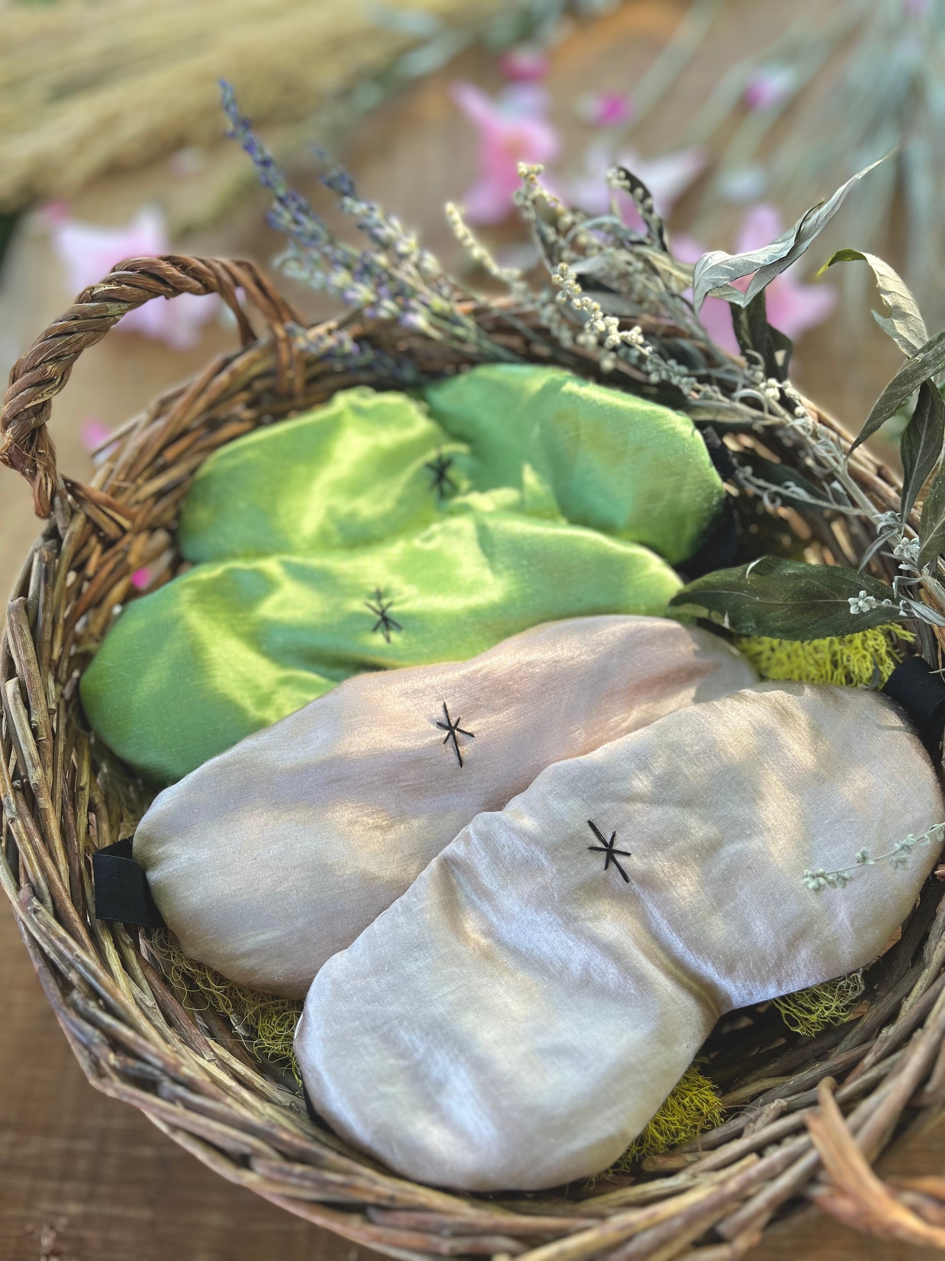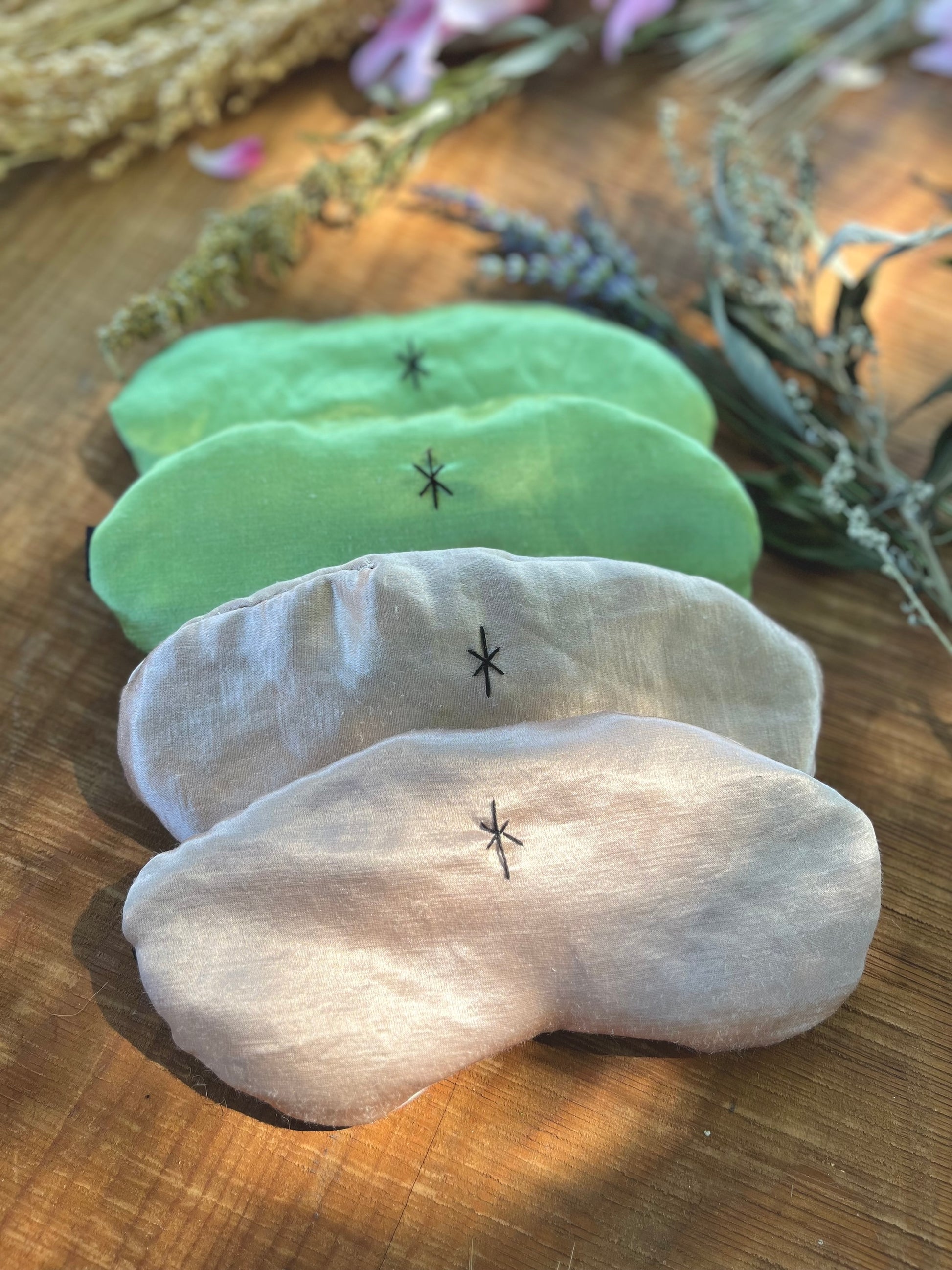 Dream pillow sleep masks are handmade from a hemp-silk blend fabric with black elastic band. Inside is a special blend of homegrown lavender, foraged river mugwort, and rice. Pillow can be warmed.