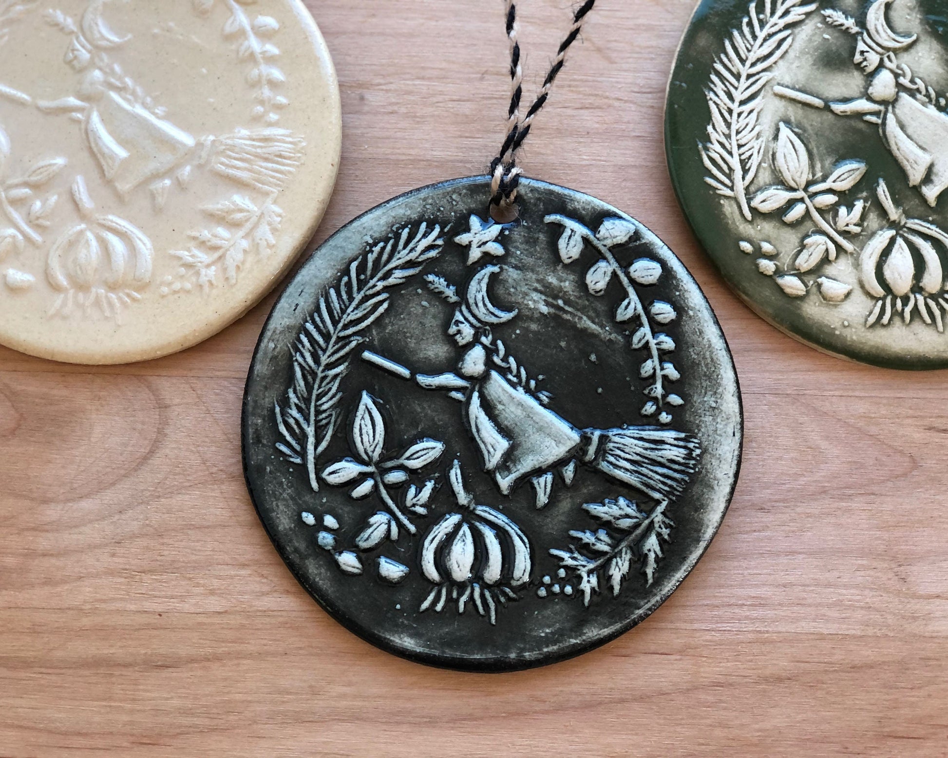 The apron-clad witch is surrounded by important Italian herbs including oregano, artemisia (mugwort), garlic, rue, and rosemary, and measures 5" in diameter.