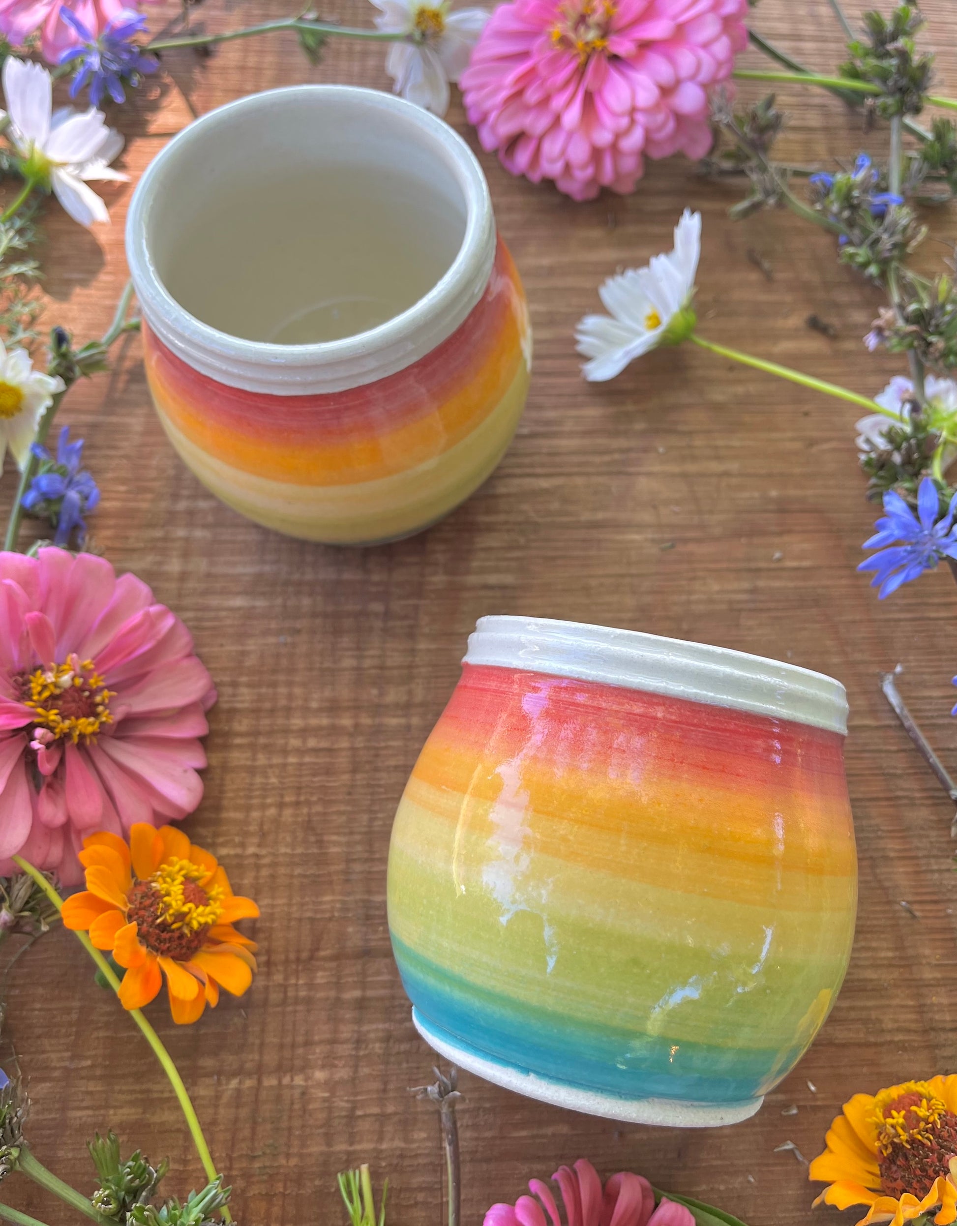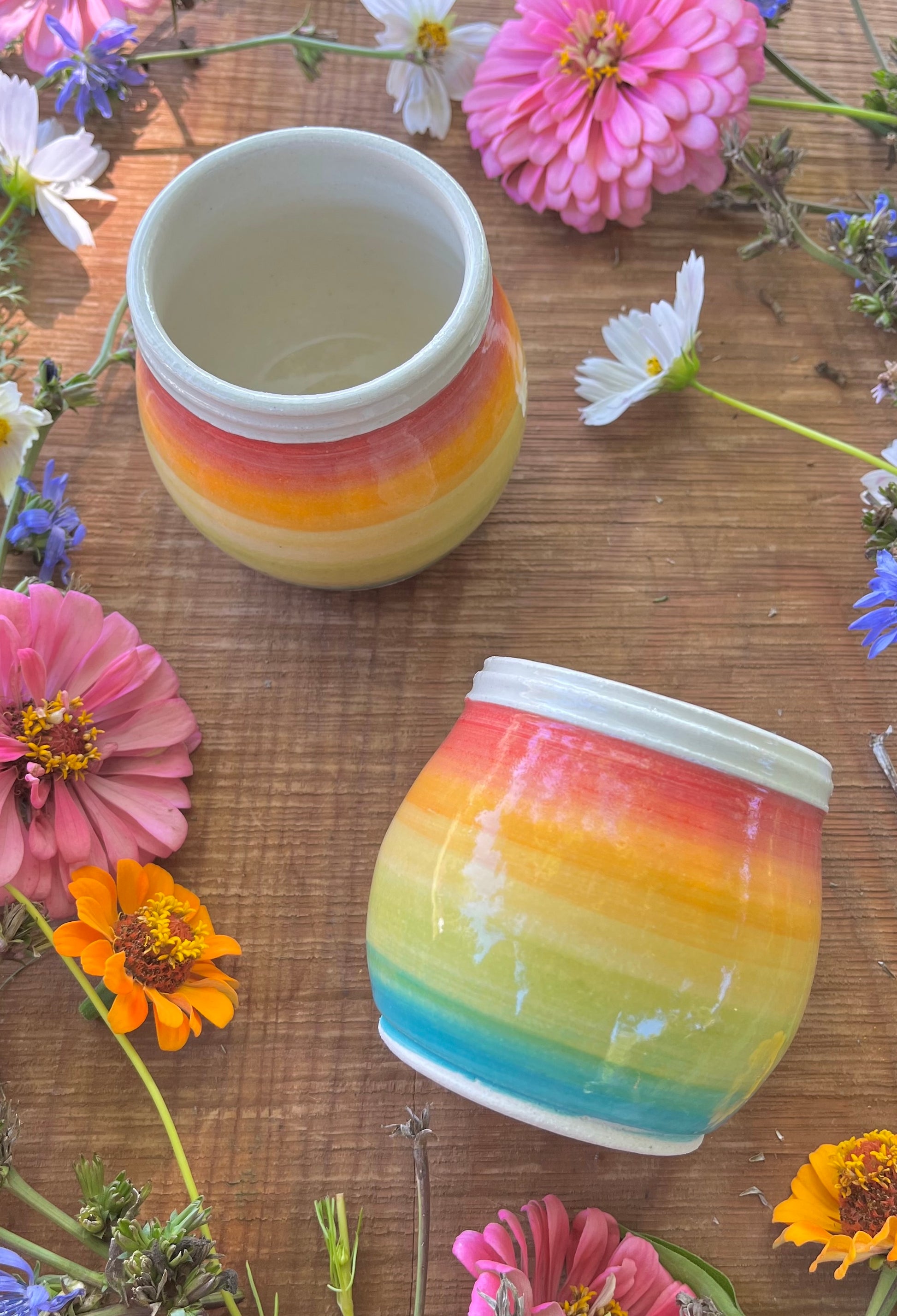 Wheel-thrown and hand-painted, these unique ceramic cups are glazed with a gradient rainbow design, a sturdy bottom to avoid spills, and a ridged rim for a bit of grip.