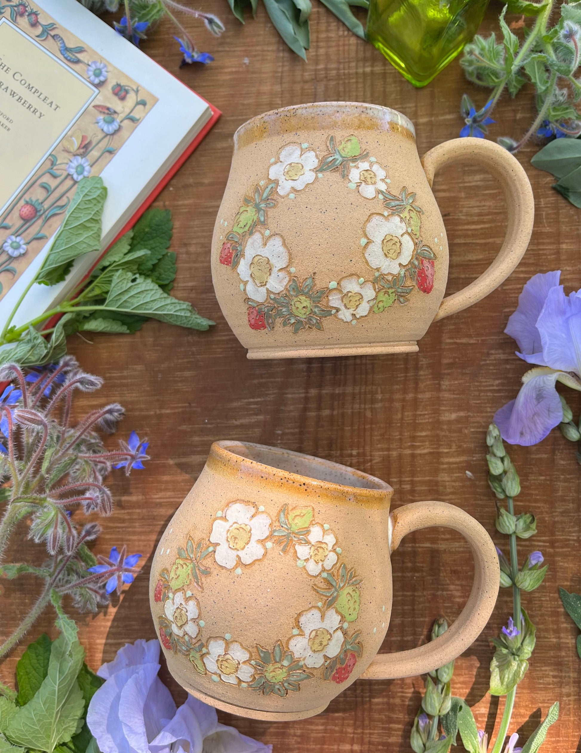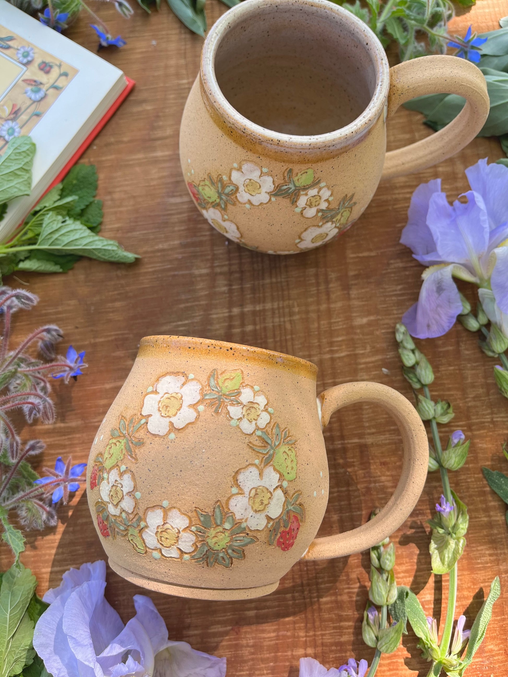 With cute vintage vibes, these wheel-thrown mugs are hand-painted and carved with a wreath of blossoming strawberry vines over a speckled brown clay body. Interior has a glossy speckled glaze. Bottom is unglazed and sanded smooth.