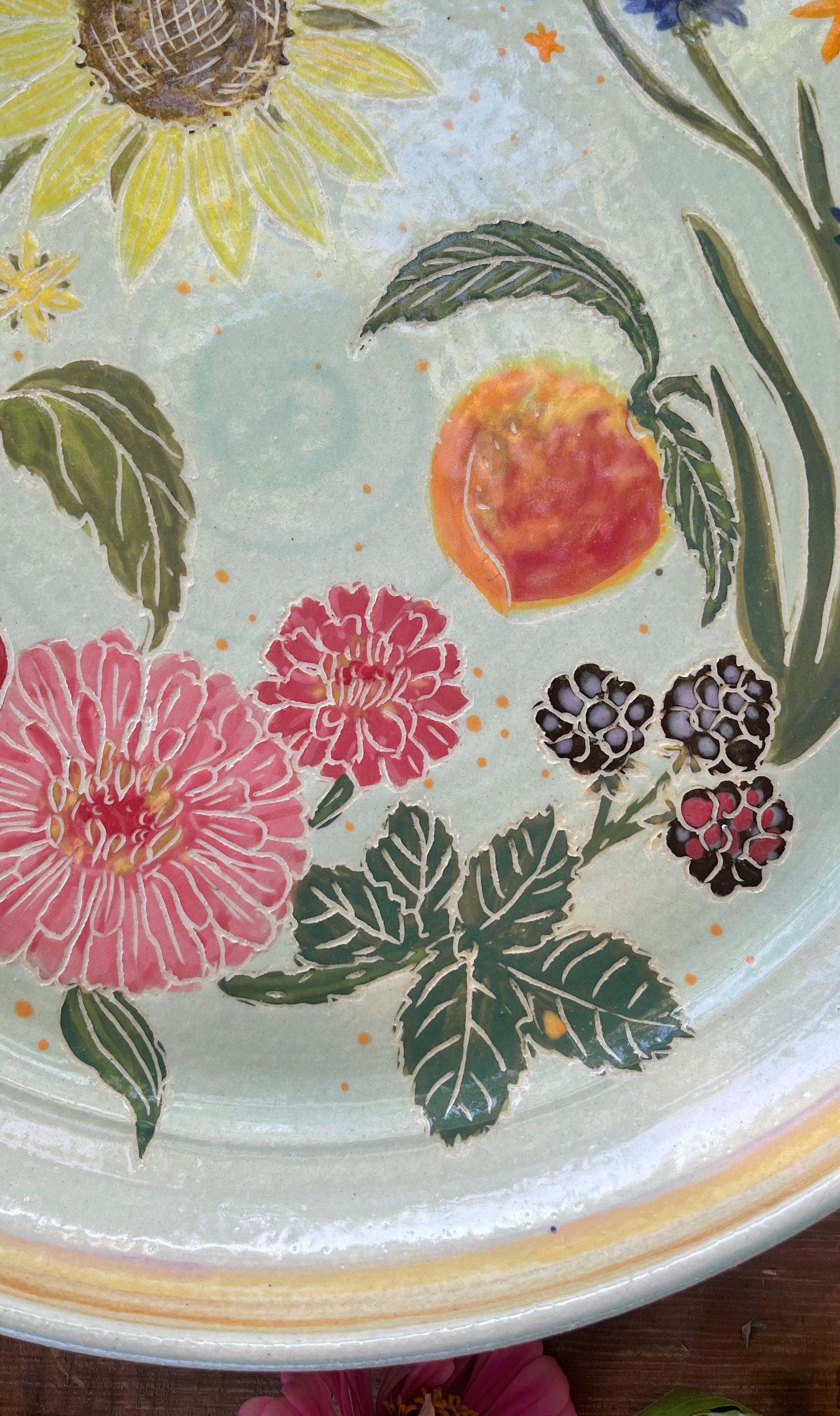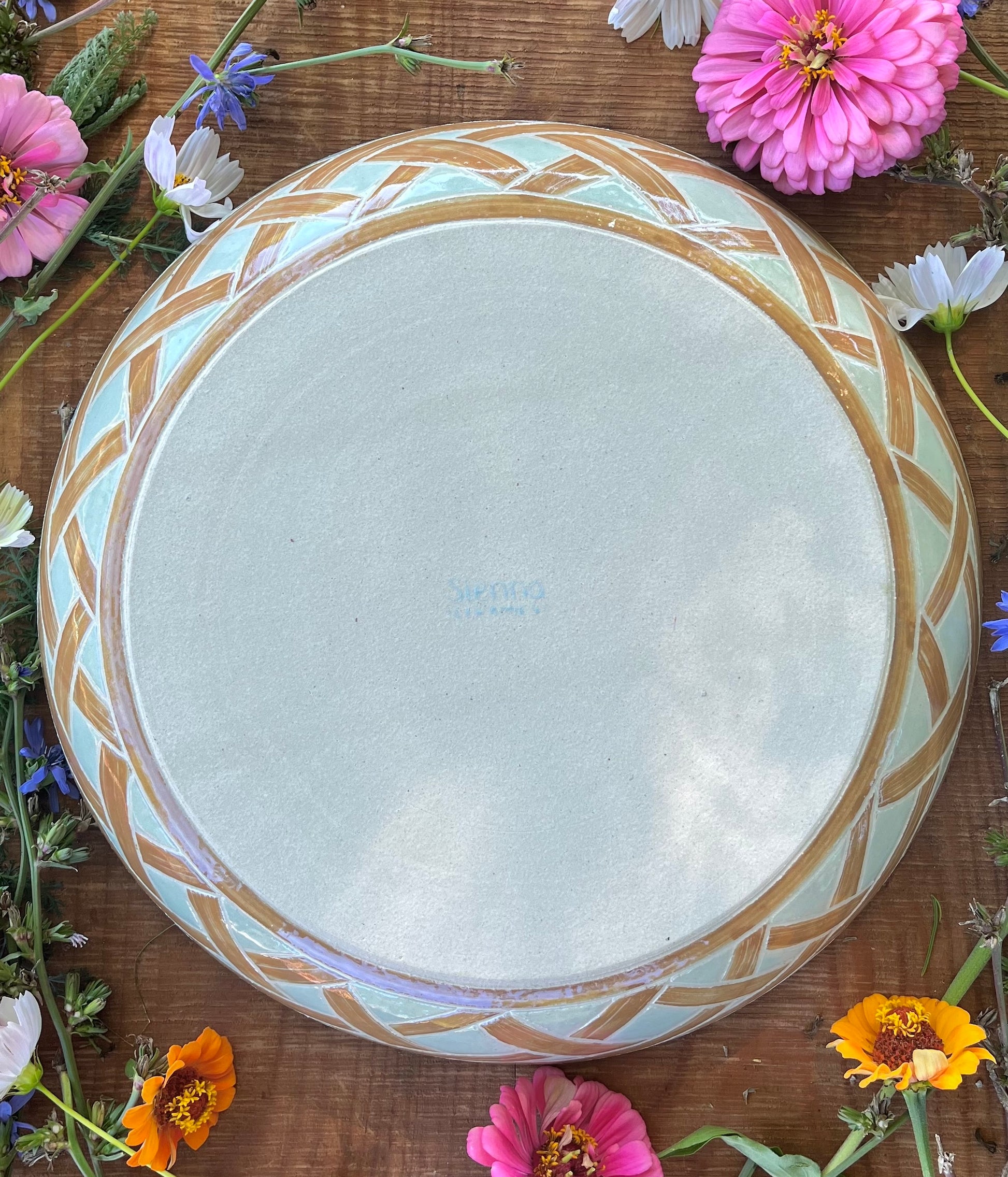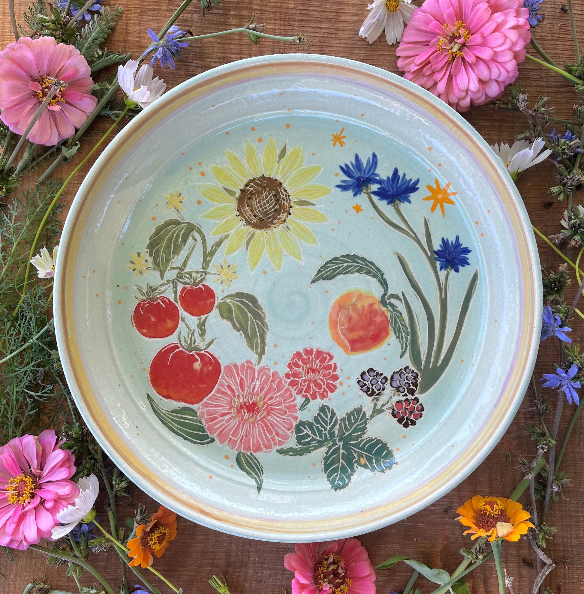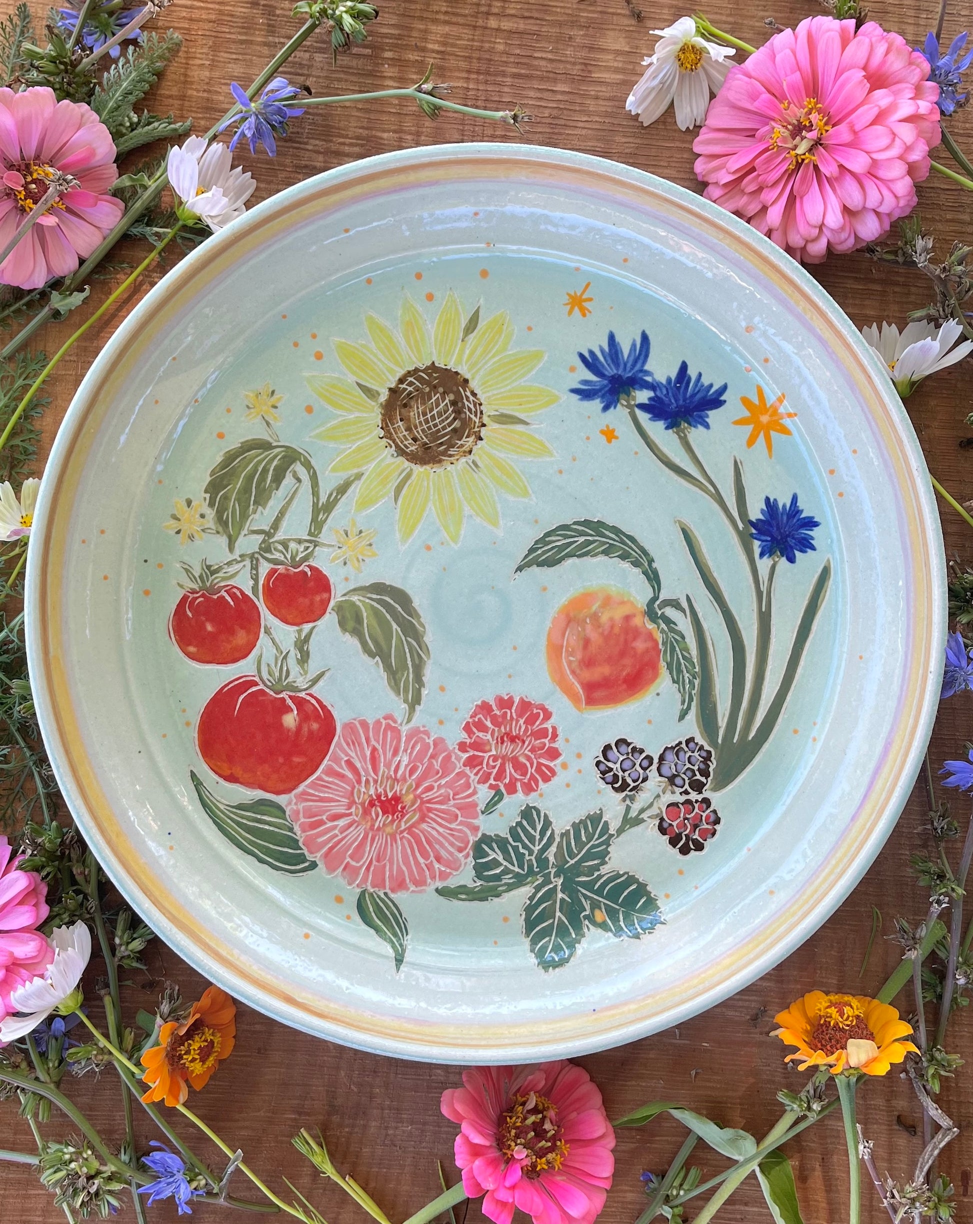 This handmade statement platter is wheel-thrown and hand-painted with the bounty of a summer harvest! Vibrant zinnias, cornflowers, sunflower, peach, blackberries, and tomatoes over a pale blue backdrop. Multicolored rim. Flip the platter over to reveal an intricate basketweave design. Glossy clear glaze. Makes a beautiful serving dish or fruit bowl.
