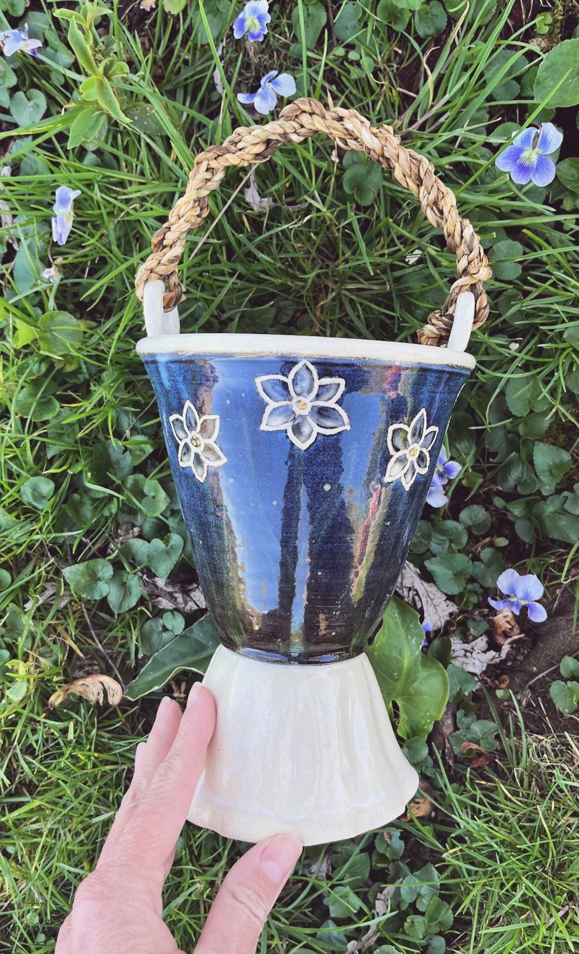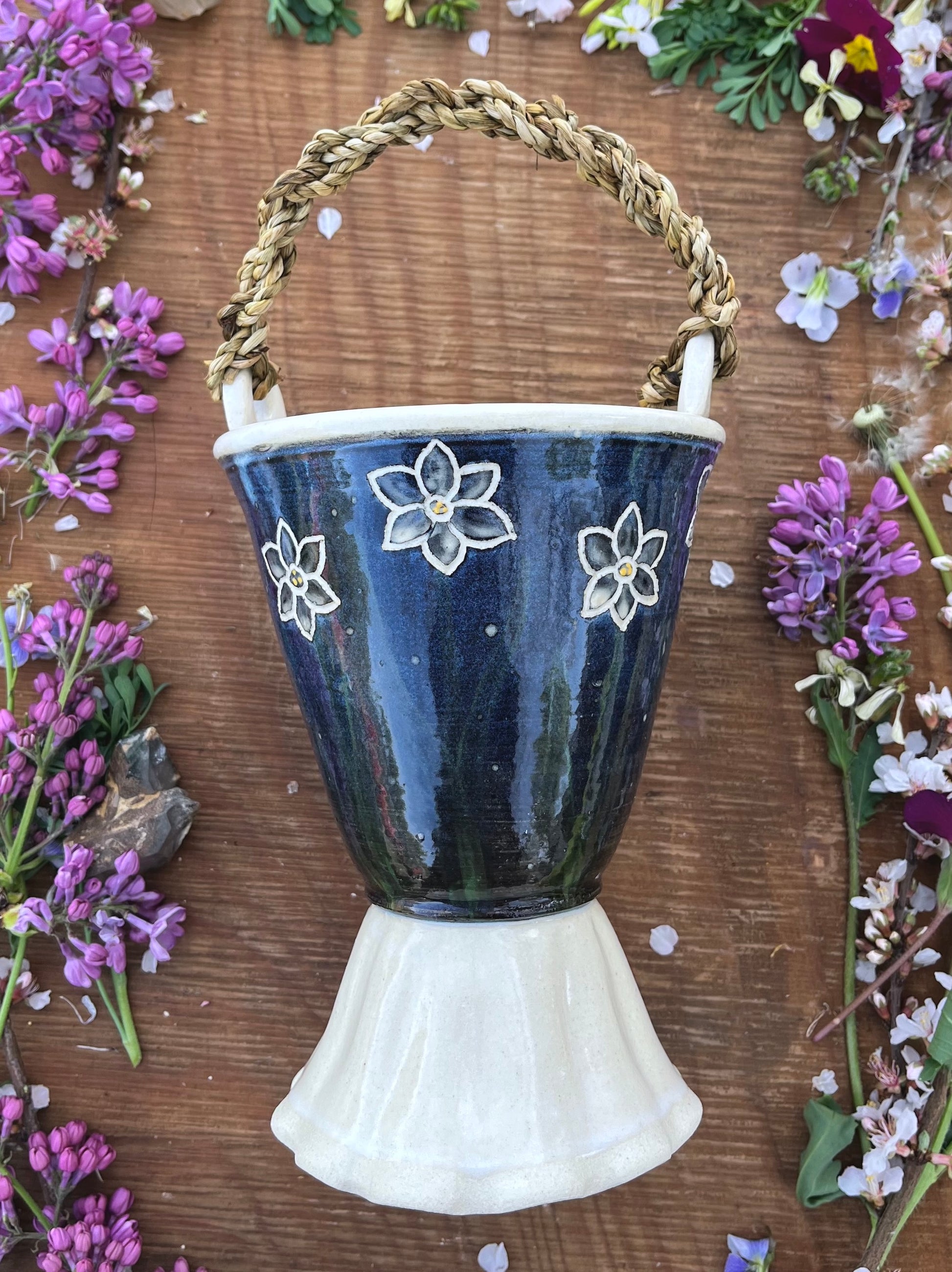 This wheel-thrown pottery bowl is the perfect picking and displaying vessel for flowers, or a serving bowl for berries, violets, cherry tomatoes, peas, and other garden treats. It also makes a unique sculptural piece for your kitchen or living space. Durable 4-ply handle is made from homegrown Narcissus stems.