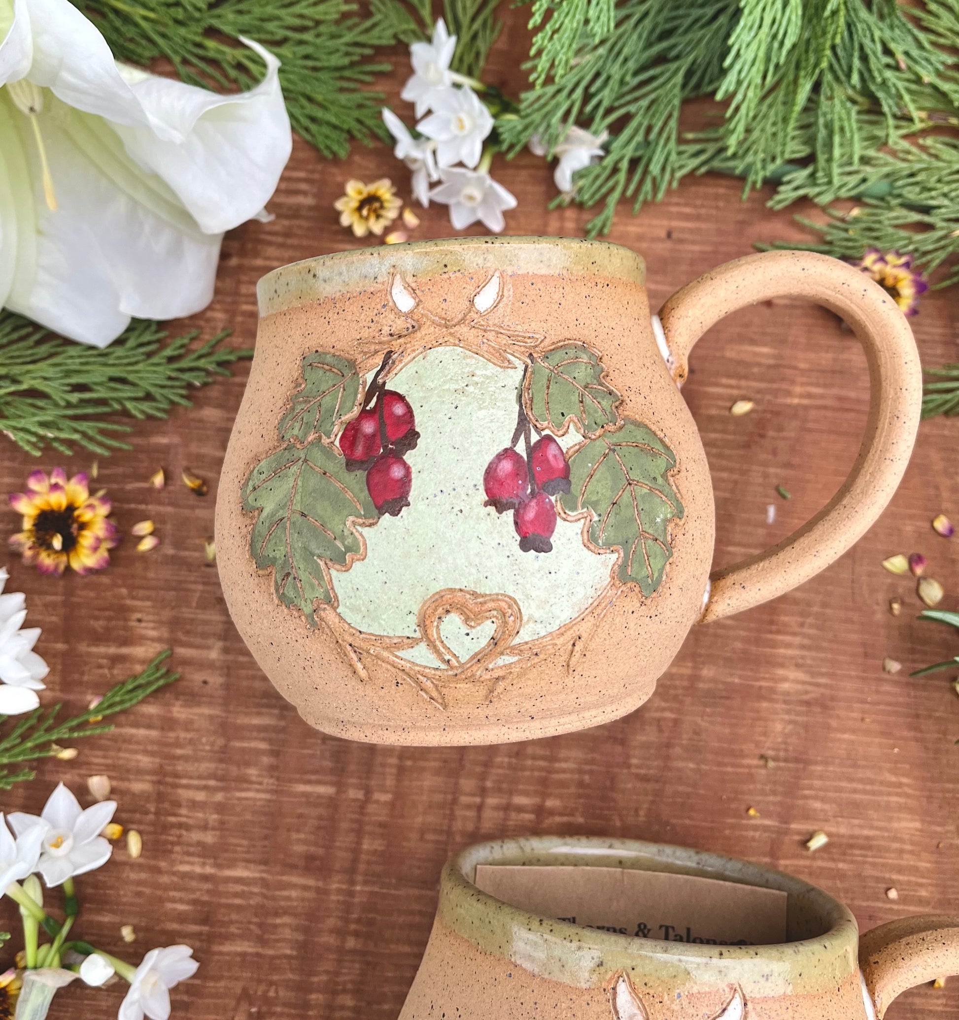 Hand-painted hawthorn is accompanied by a raised, slip-trailed design on an unglazed speckled exterior. Glossy pale green glaze on the interior and lip. Durable ceramic mug is microwave, and dishwasher safe.