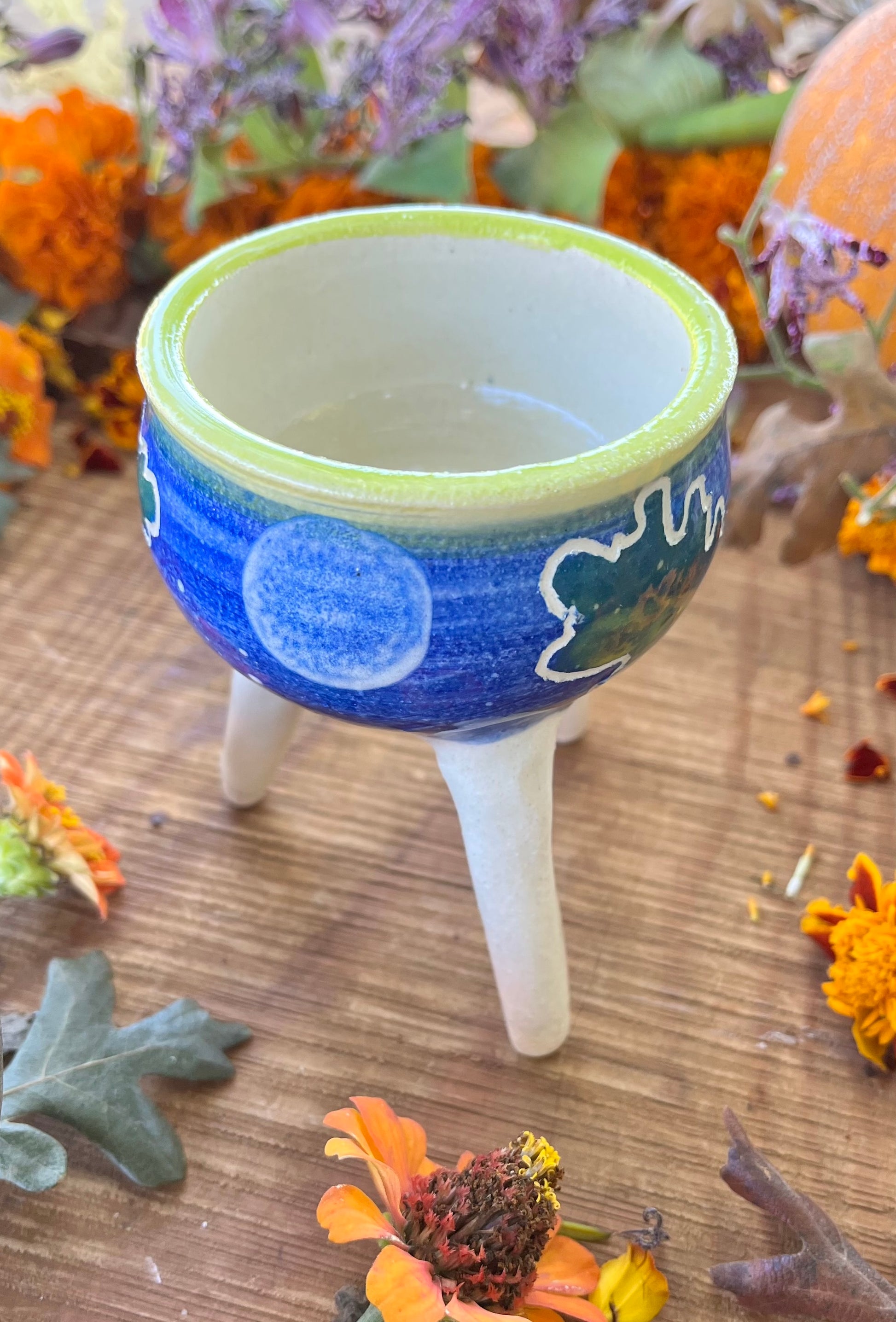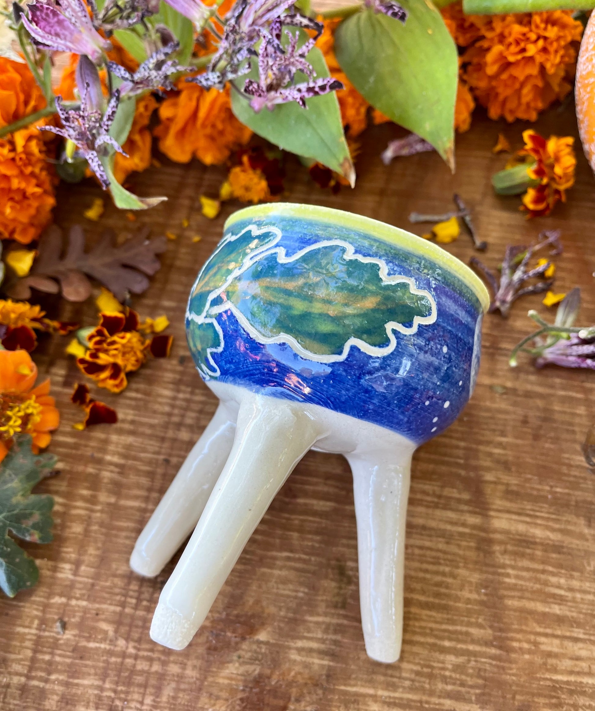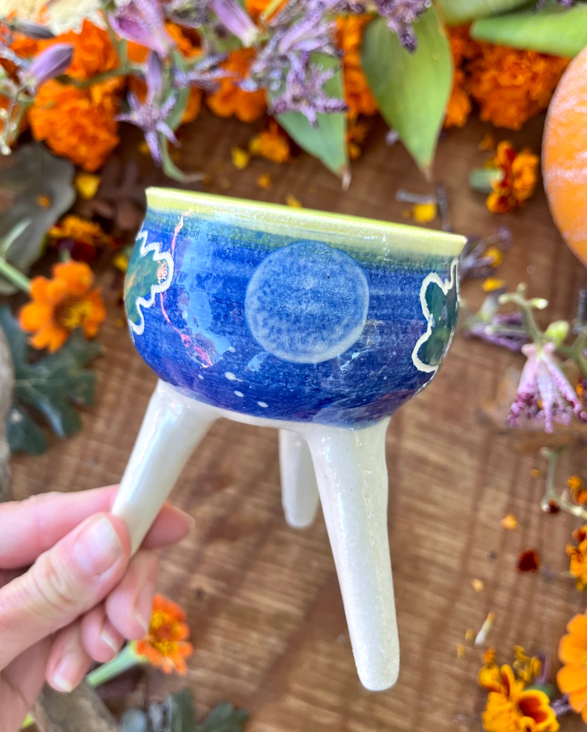 This witchy, ceramic incense burner has a full moon and Valley Oak branches over a cobalt blue backdrop. There are three feet, and a tiny calendula stamped on the bottom. Burn loose incense with charcoal, incense cones, or use as a candle holder.